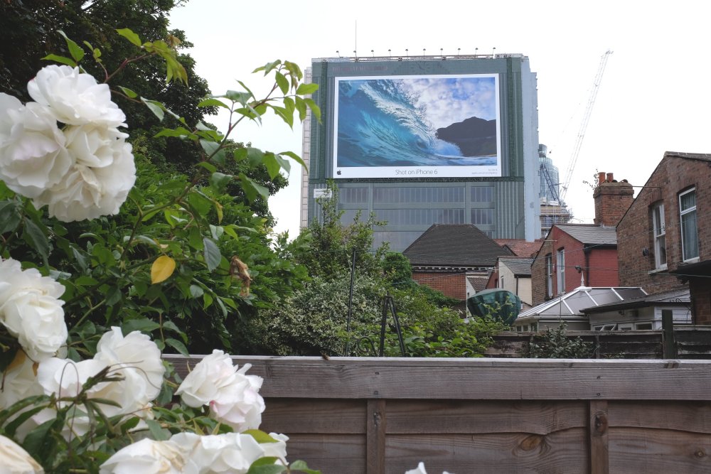 Looking east from the garden you can see the Edwardian houses of York Road and a huge advertising poster fixed on an old tower block, there to catch the eyes of the motorists approaching London on the M4. And it give us the warning that we are nearly there after the long drive from Aberdeenshire.