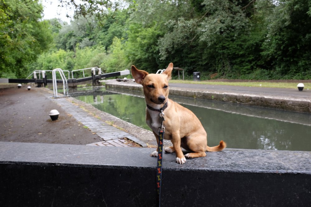 We are enjoying our walks along the canal and Poppy certainly looks the part of a canal dog perching on the lock gates.
