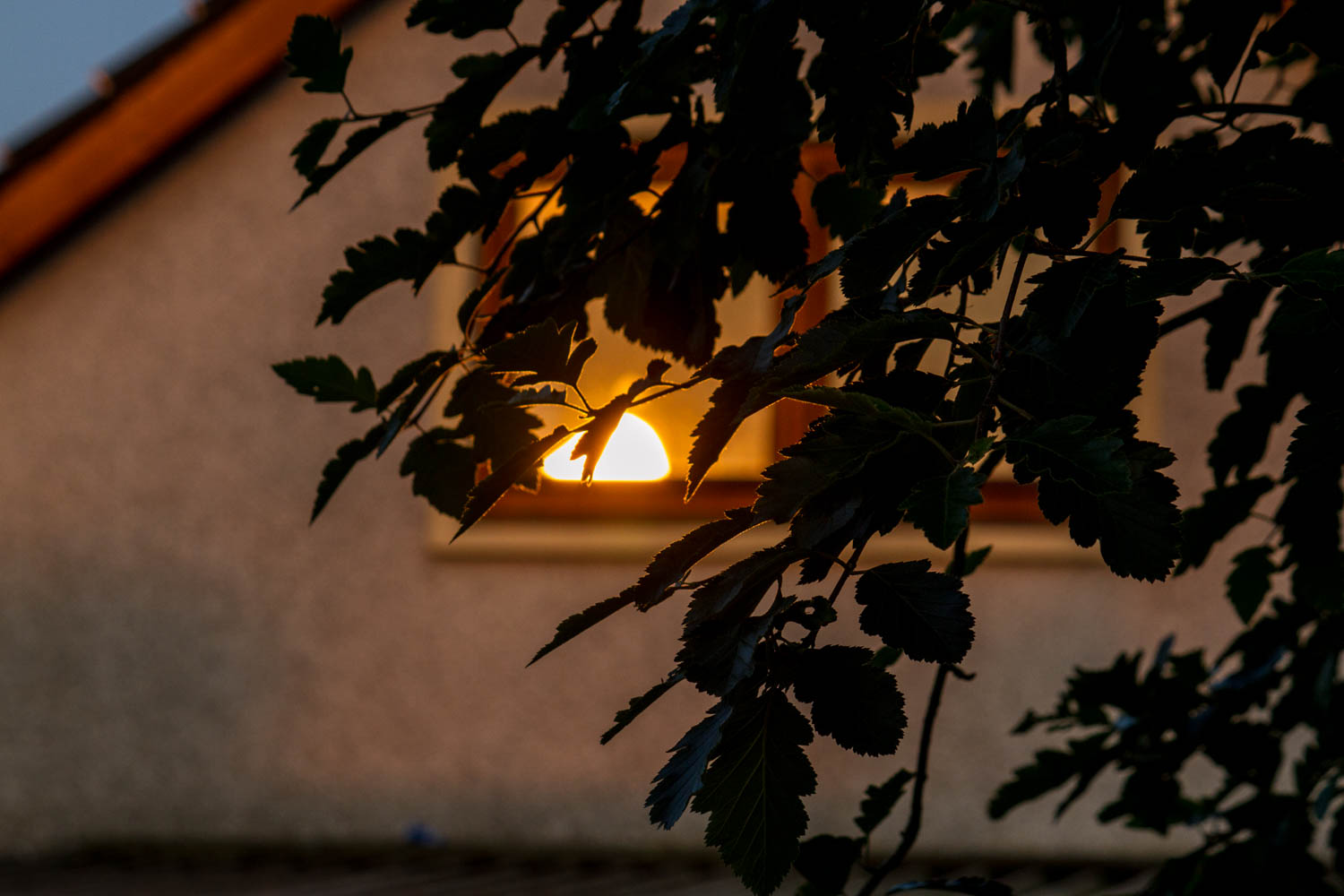Starting at home, here are a few pictures taken from Hatton. It all started that July morning when I was woken by the orange glow of the sun through the bedroom window. In the first picture you can see the refelction of the sun in the window when I staggered outside with my camera. The fog muted the intensity of the sun and gave everything a wonderful orange glow. I walked through the village snapping away, all on my own in the early sunrise hour.