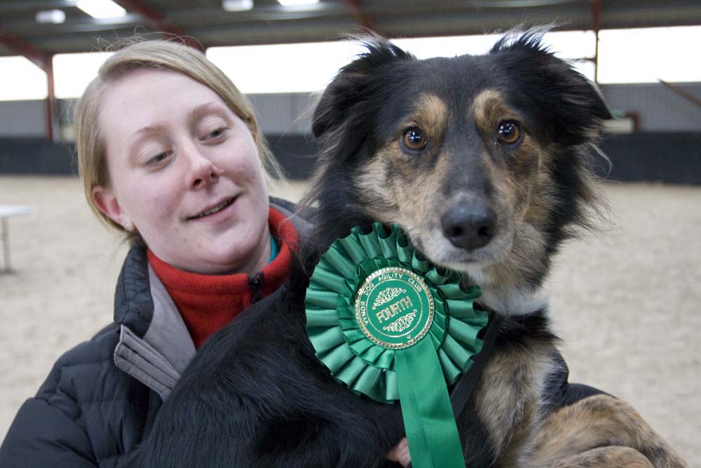 Gillie is a young farm collie which Fiona brought back from Ireland. He just loves to jump and of course, to get a cuddle, proudly showing off his rosette.