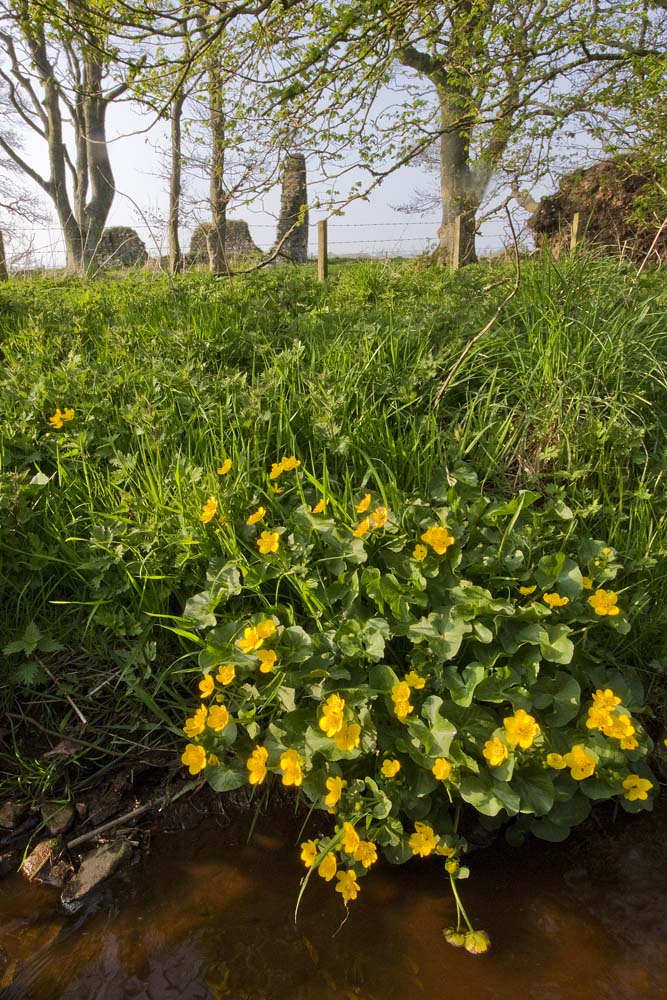 On this day of Pentecost 2013 I visited the chapel and took a few photographs. It is a wonderful little place surrounded by mature trees, not yet in leaf, concealing what is thought to be a graveyard. A little burn with yellow marsh marigolds in bloom, flows past the site.